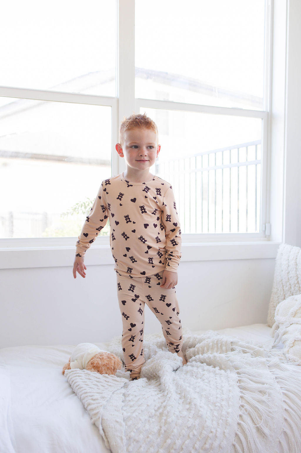 The tan backdrop with brown teddy bears and hearts brings cozy sweetness to every night’s routine — a perfect match to our beloved romper for sibling sets.